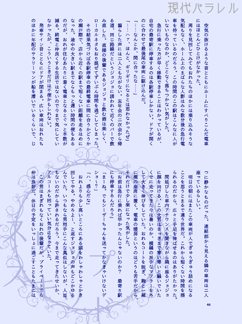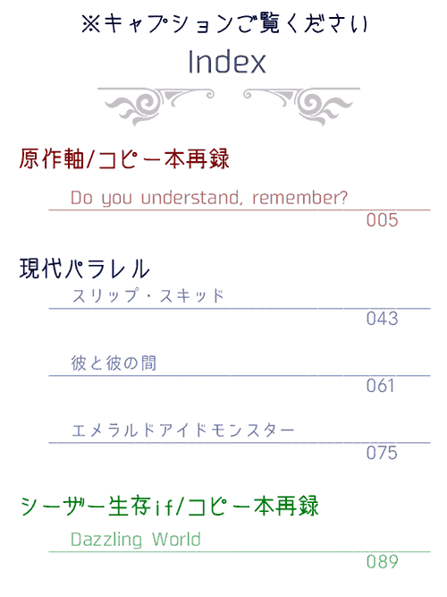 2014年に発行したコピー本2種+お蔵出しネタ(一部にweb再録含む)の、詰め合わせ本。原作軸、生存if、現代パラレルを含みます。